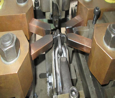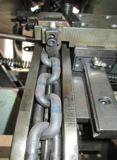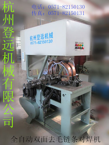 本公司生产供应(50、125、200)KVA, QMHJ系列链条去毛对焊机。主要用于(φ3-14mm)链环焊接全自动生产,本机采用全机械工作,二级开式斜齿轮传动,电机皮带张紧调节,传动平稳,冲击小、能耗低、操作简单。工作过程:拉链(带感应保护)、扶正、电极夹紧、预顶、通电(可三次通电)、猛顶、电极退,横向去毛(前进后退)、纵向去毛(前进后退)完成单个工作循环。本系列链条对焊机适用于高强度起重链,汽车防滑链、葫芦手拉链、工业环链、船用链,所生产的链条外形美观,强度高、质量稳定。
