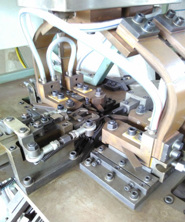 电极传动摇臂机构采用双凸轮,余弦运动曲线,降低冲击力;配合弹簧工作,使电极磨损自动补偿,节约电极调整时间提高工作效率,同时减轻电极接触面对焊接链环的电脚印烧伤。