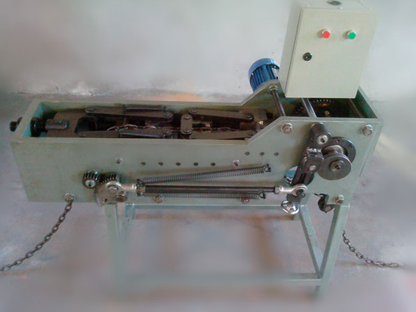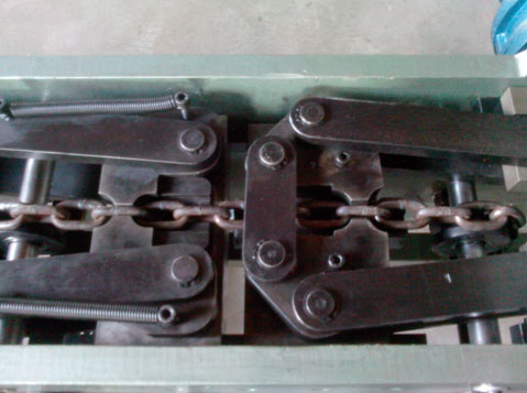 B系列链条校正机DY-B10XZJ采用摆线针轮减速机直接带动主轴(曲轴)大齿轮传动,结构紧凑,传动平稳输出扭矩大。拉链采用余弦修正曲线平面凸轮传动带动摇臂,通过关节连杆带动扇形齿轮,再啮合小齿轮带动链轮轴并拉链,拉链过程采用拉簧带动拉链,以保护链条及机械结构,拉链平稳准确。校正部分分活动校正块与固定校正块,链条尺寸可调节固定校正块调整拉伸量,调整范围(0-15mm),根据客户要求可配拉力传感器、拉力显示器,也能更加直观体现拉力值。效率每分钟108-144环,最大拉力8吨。